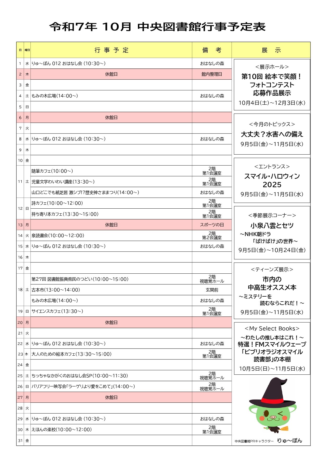 中央図書館の行事予定表です。(厚狭図書館の行事予定表はこちらをクリック)