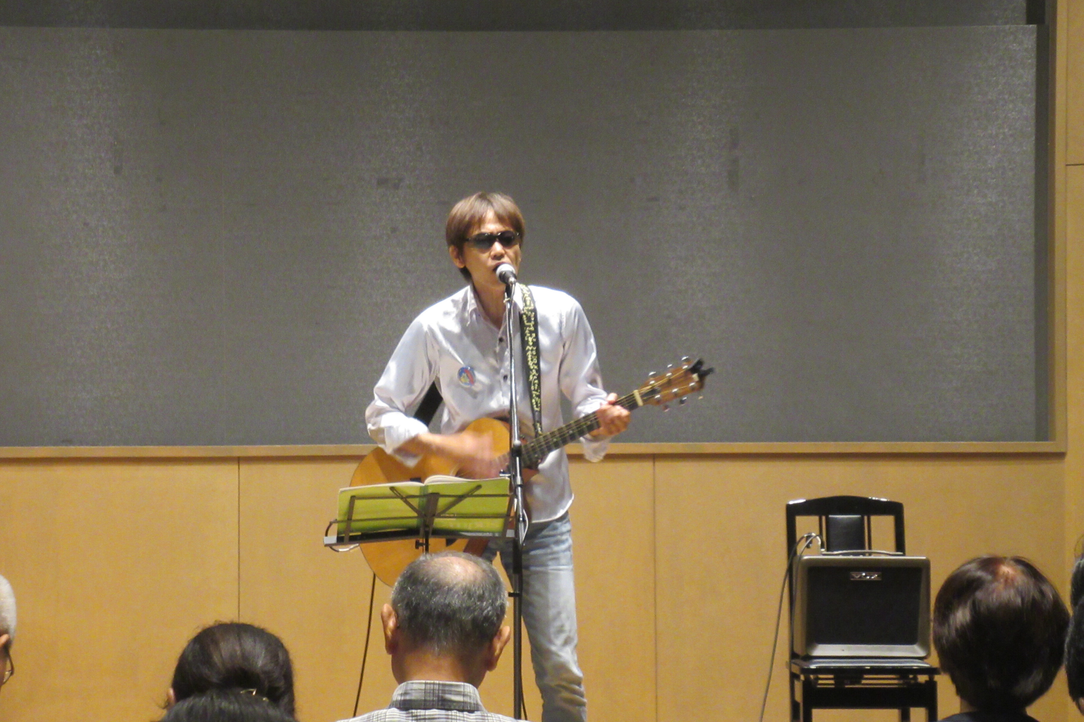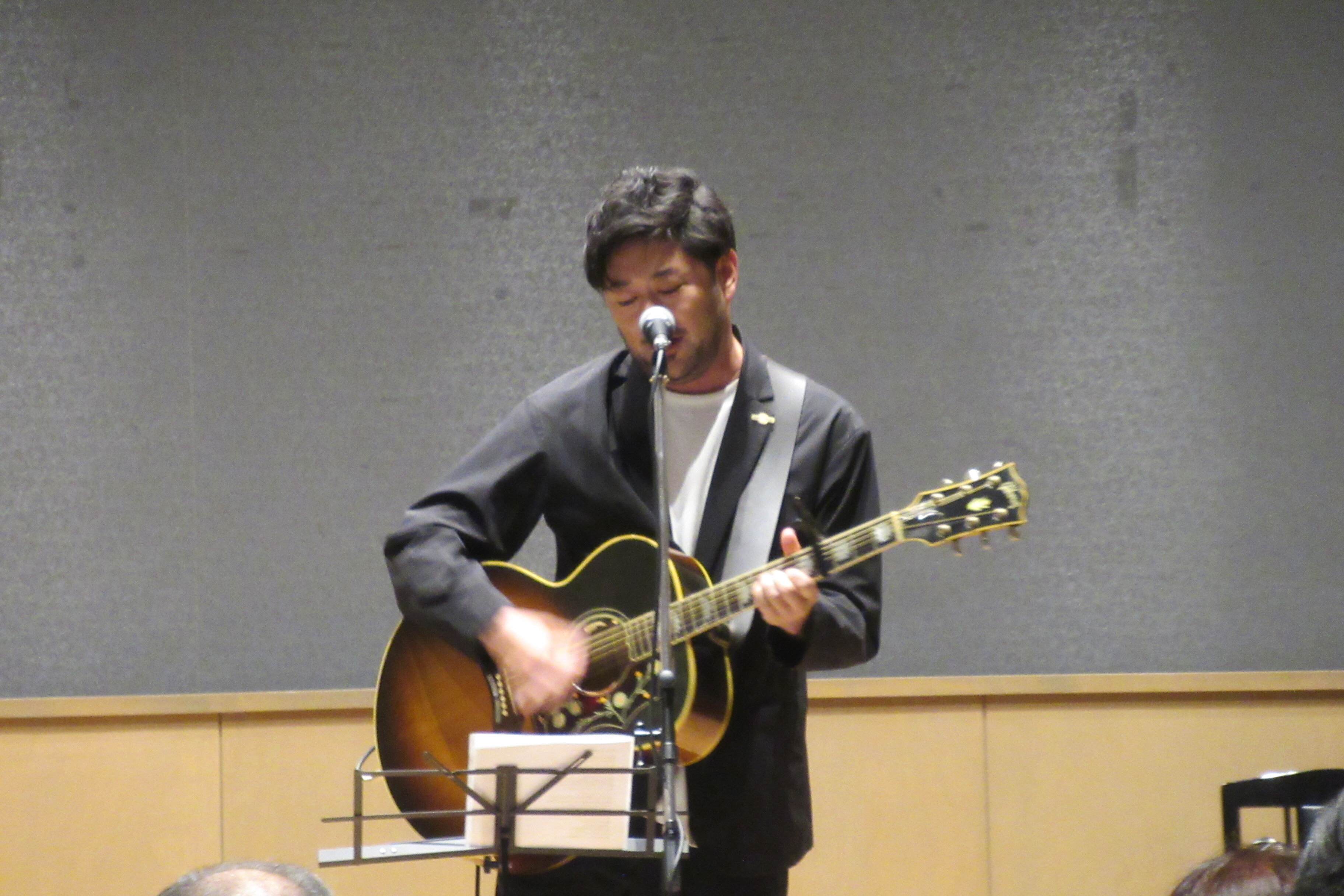 共に市内在住のシンガーソングライターである西広ショータさん(山陽小野田市スペシャルスマイルプランナー)とフジ★ロックさんが図書館の歌を披露しました。