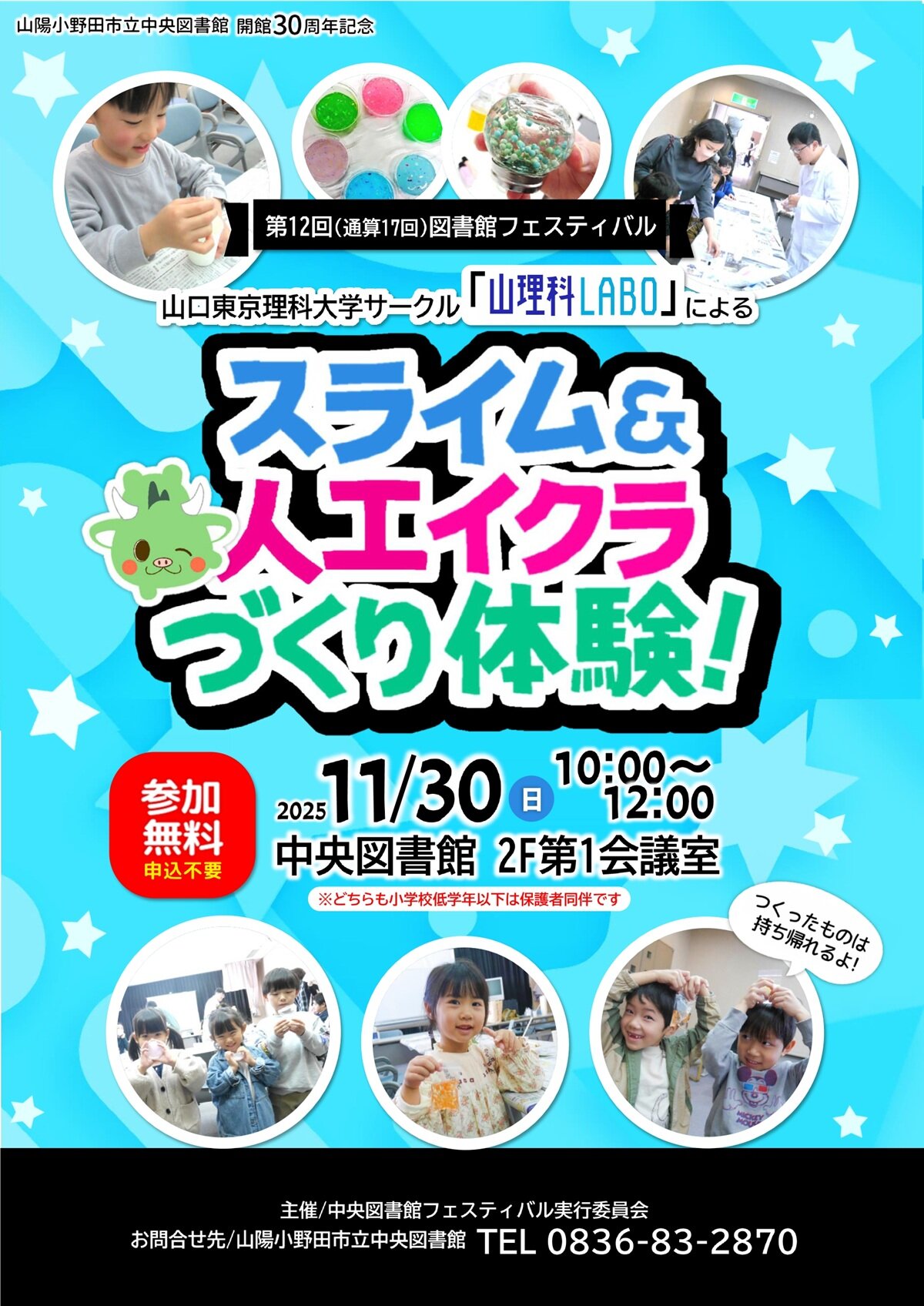 第12回図書館フェスティバル 山理科LABOによるスライム&人工イクラづくり体験! 11月30日(日曜日) 山陽小野田市立中央図書館 開館30周年記念 山口東京理科大学の実験サークル"山理科LABO"さんと科学遊びを楽しみませんか?作ったものは持ち帰りOK! 開催日時 11月30日(日曜日)10:00~12:00 開催場所 山陽小野田市立中央図書館 2F 第1会議室 参加費 無料 対象 どなたでも ※小学生低学年以下は保護者同伴です。 参加申込み 申し込み不要(当日先着順) お問合せ先 山陽小野田市立中央図書館 TEL:0836-83-2870