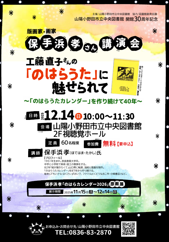 詩人・童話作家 工藤直子さんの詩集「のはらうた」を基にカレンダーの原画を作り続けている山口市在住の版画家・画家の保手浜 孝(ほてはま たかし)さんを迎えて、講演を開催します。