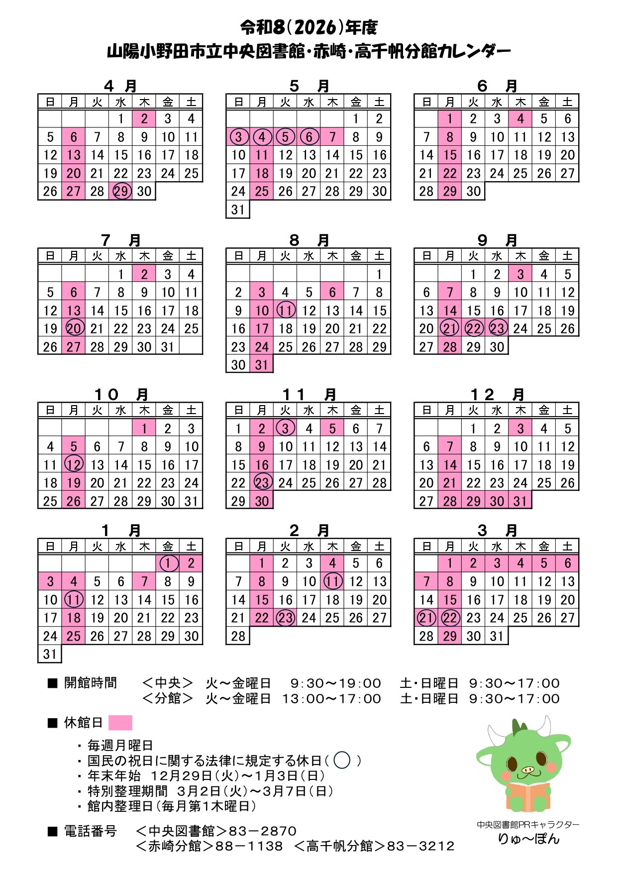 2026年度(令和8年度)開館カレンダーを掲載します 2026年度(令和8年度)の開館カレンダーを以下のとおり掲載します(クリックすると画像を拡大できます)。 中央図書館 厚狭図書館 PDF版はこちら 2026年度(令和8年度)中央図書館開館カレンダー 2026年度(令和8年度)厚狭図書館開館カレンダー