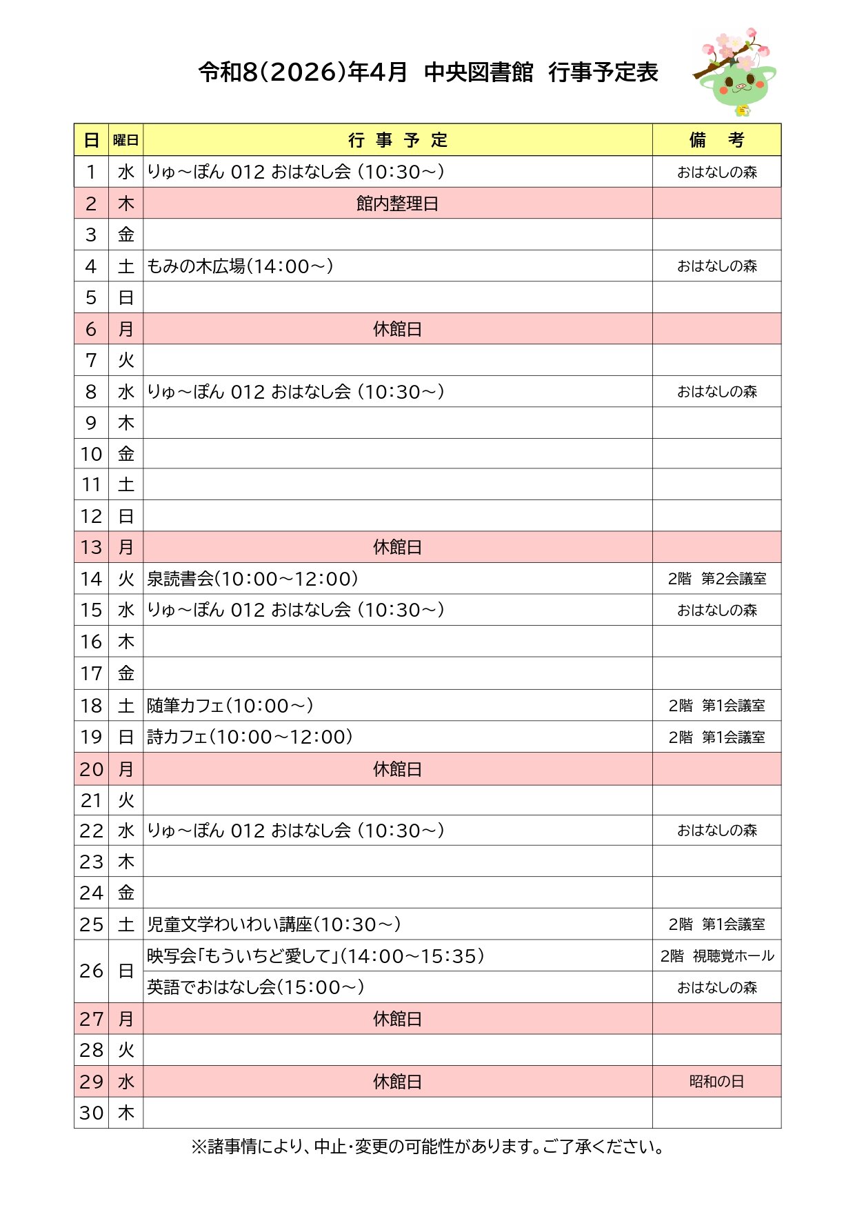 行事予定表・開館カレンダー 行事予定表 (中央図書館) 中央図書館の行事予定表です。(厚狭図書館の行事予定表はこちらをクリック) 2026年度 2026年4月行事予定表 PDF版はこちらをクリック 2025年度 2026年3月行事予定表 2026年2月行事予定表 2026年1月行事予定表 2025年12月行事予定表 2025年11月行事予定表 2025年10月行事予定表 2025年4月~9月行事予定表 2024年度 2024年10月~2025年3月行事予定表 2024年4月~9月行事予定表 開館カレンダー (中央図書館) 中央図書館の開館カレンダーです。(厚狭図書館の開館カレンダーはこちらをクリック) 2026年度(令和8年度) PDF版 はここをクリック 2025年度(令和7年度) 2025年度 中央図書館開館開館カレンダー