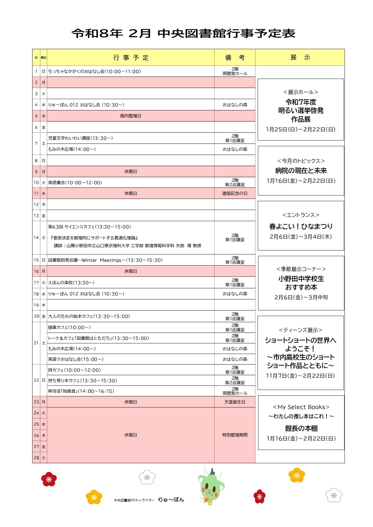 令和8年(2026年)2月行事予定表(画像をクリックすると拡大できます)。