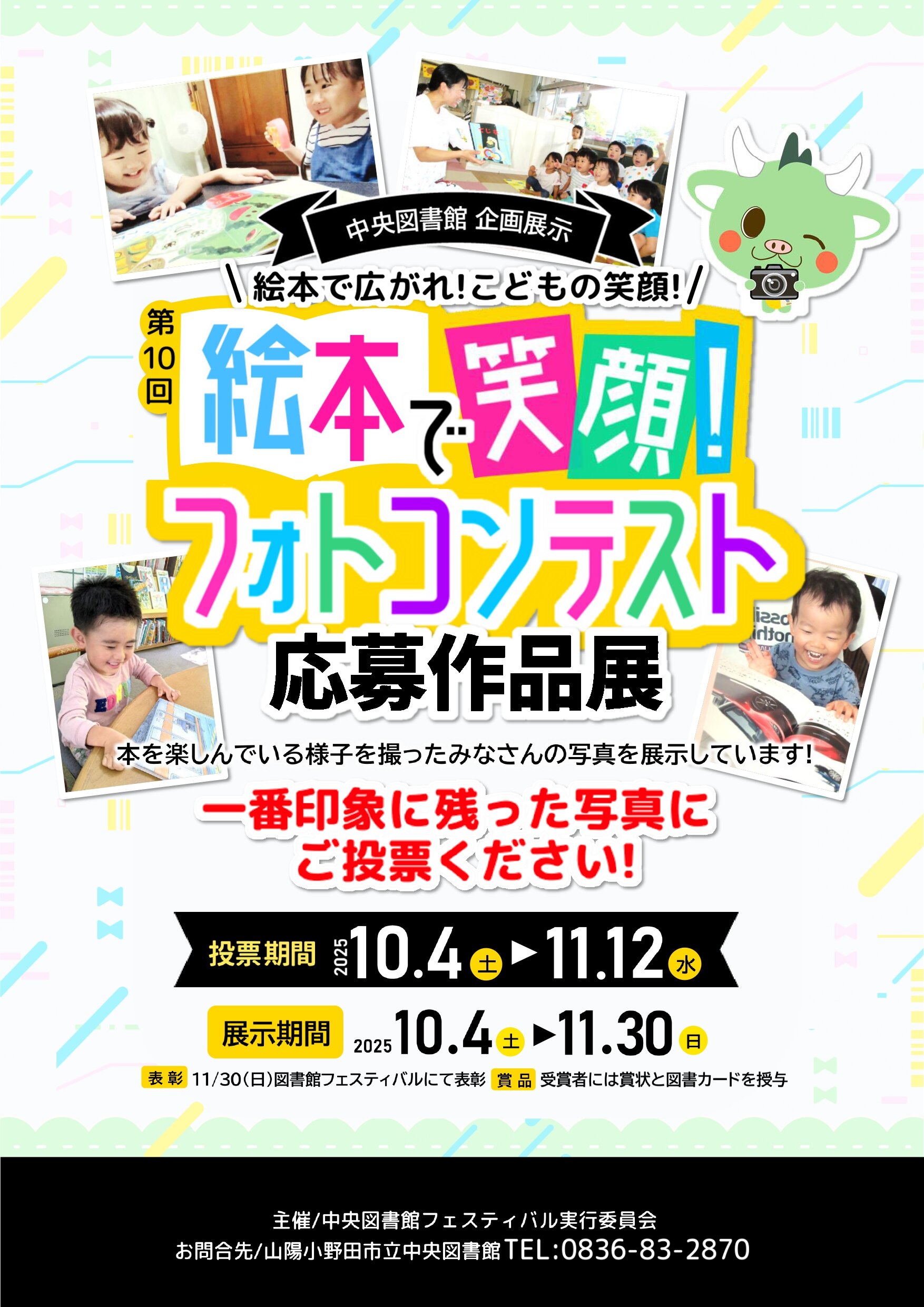 「第10回 絵本で笑顔!フォトコンテスト」に応募いただいた作品を中央図書館1F展示ホールで展示しています。ご来館の際にぜひご覧ください。