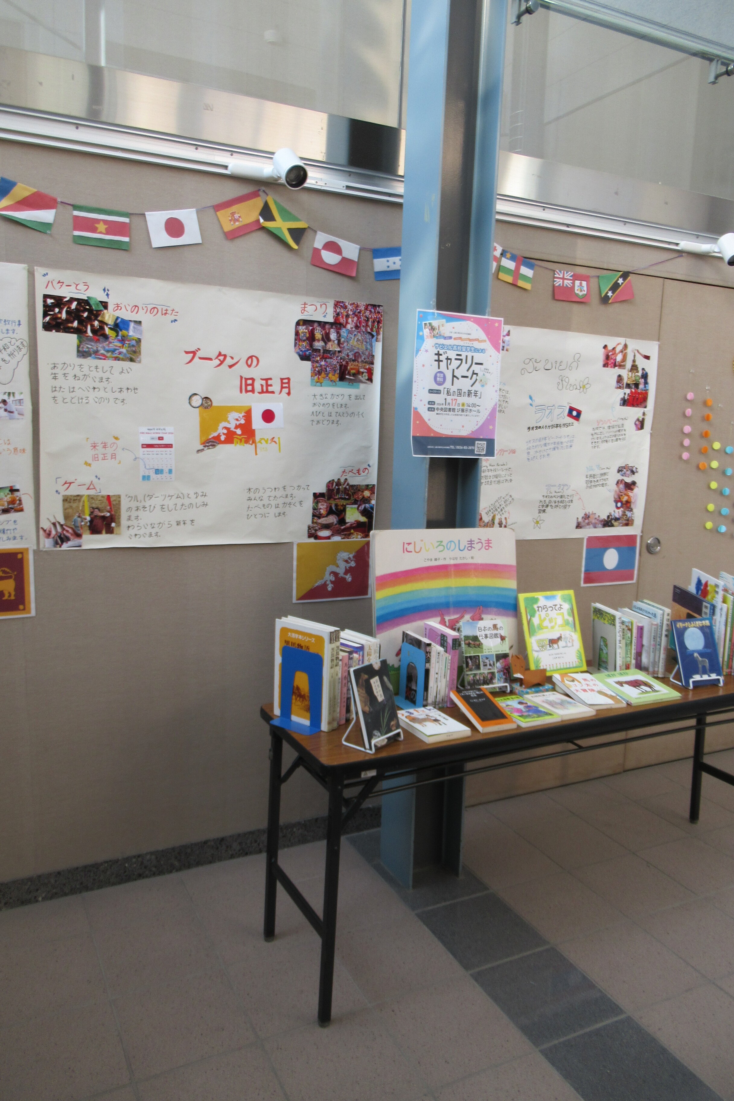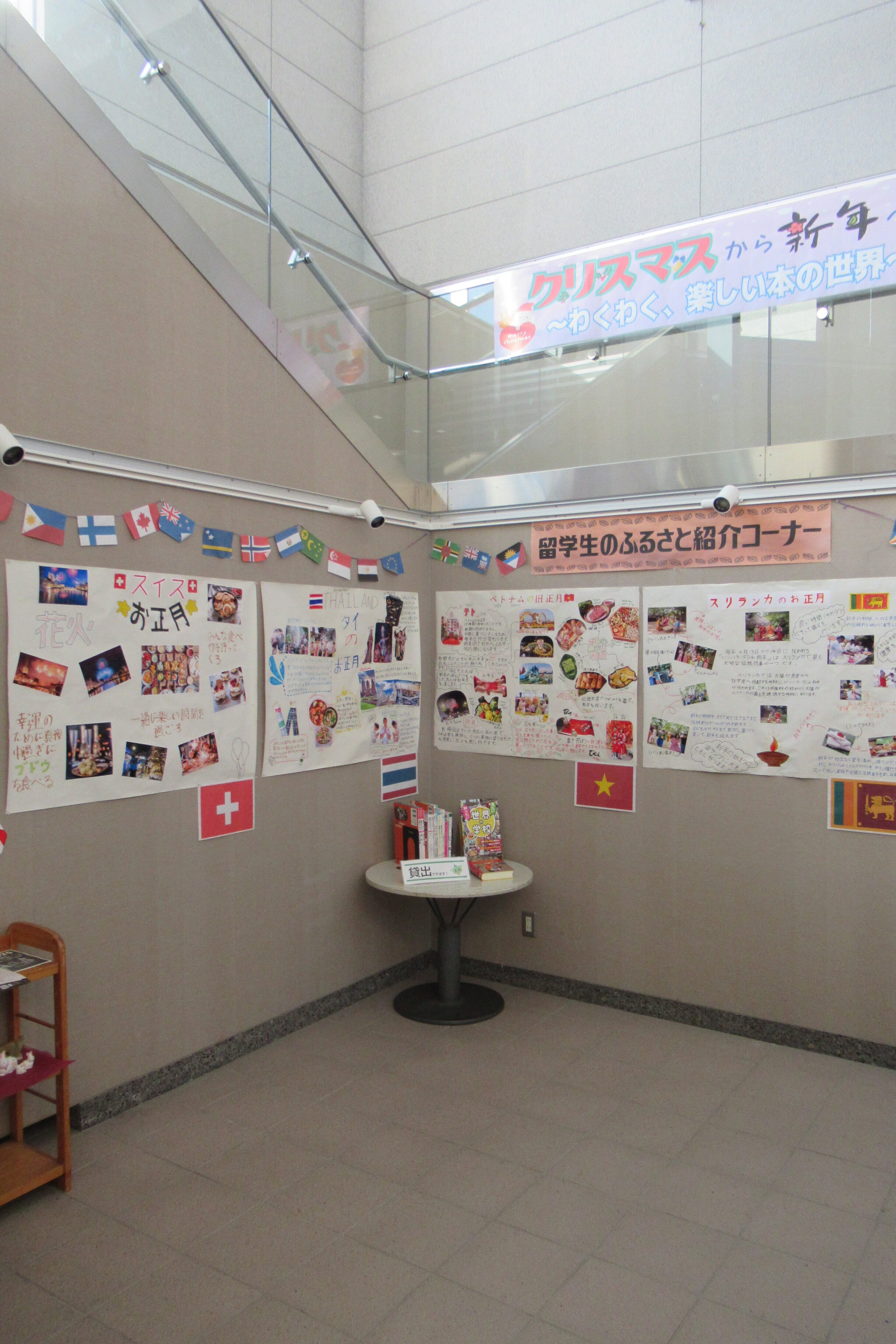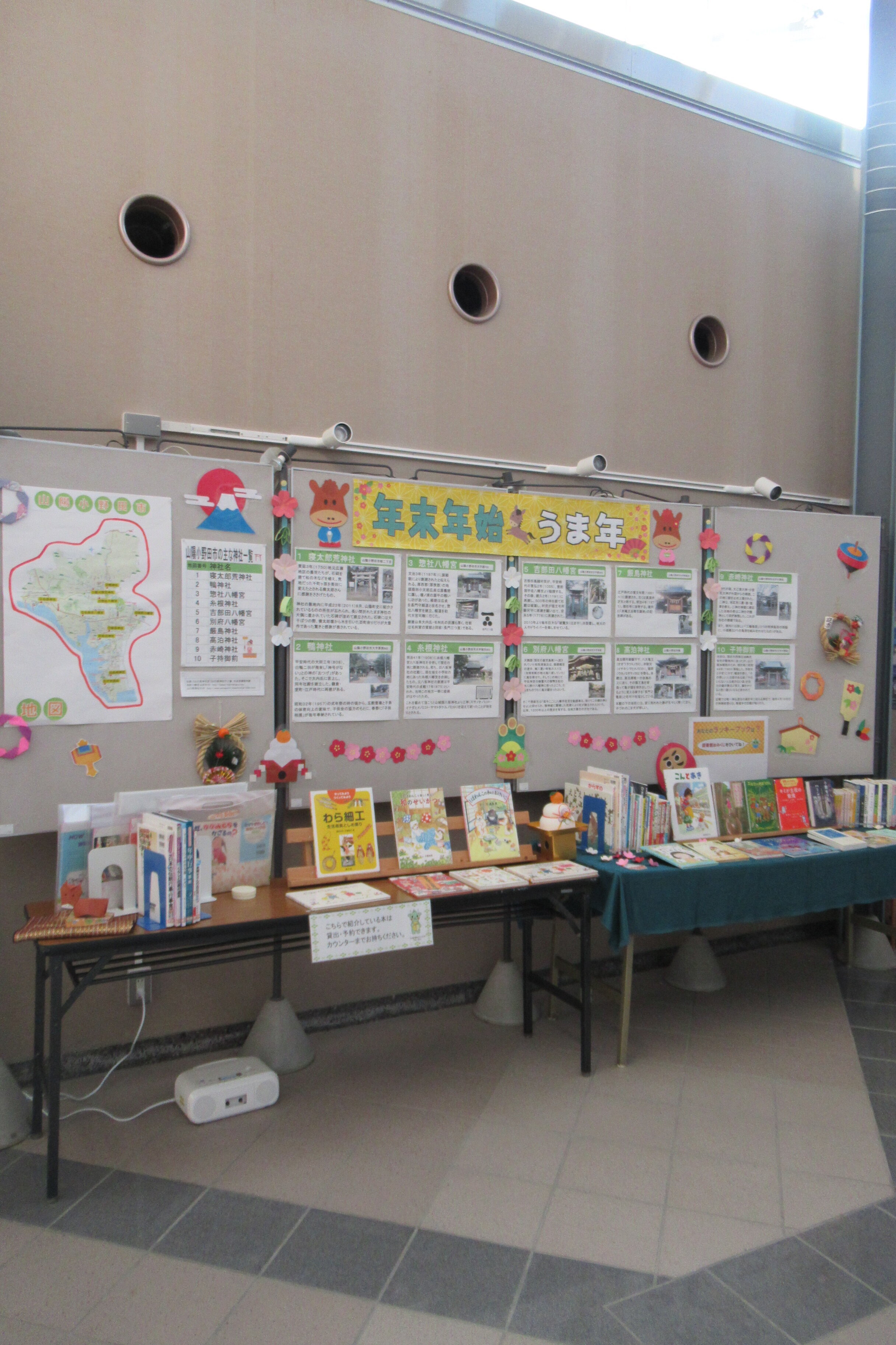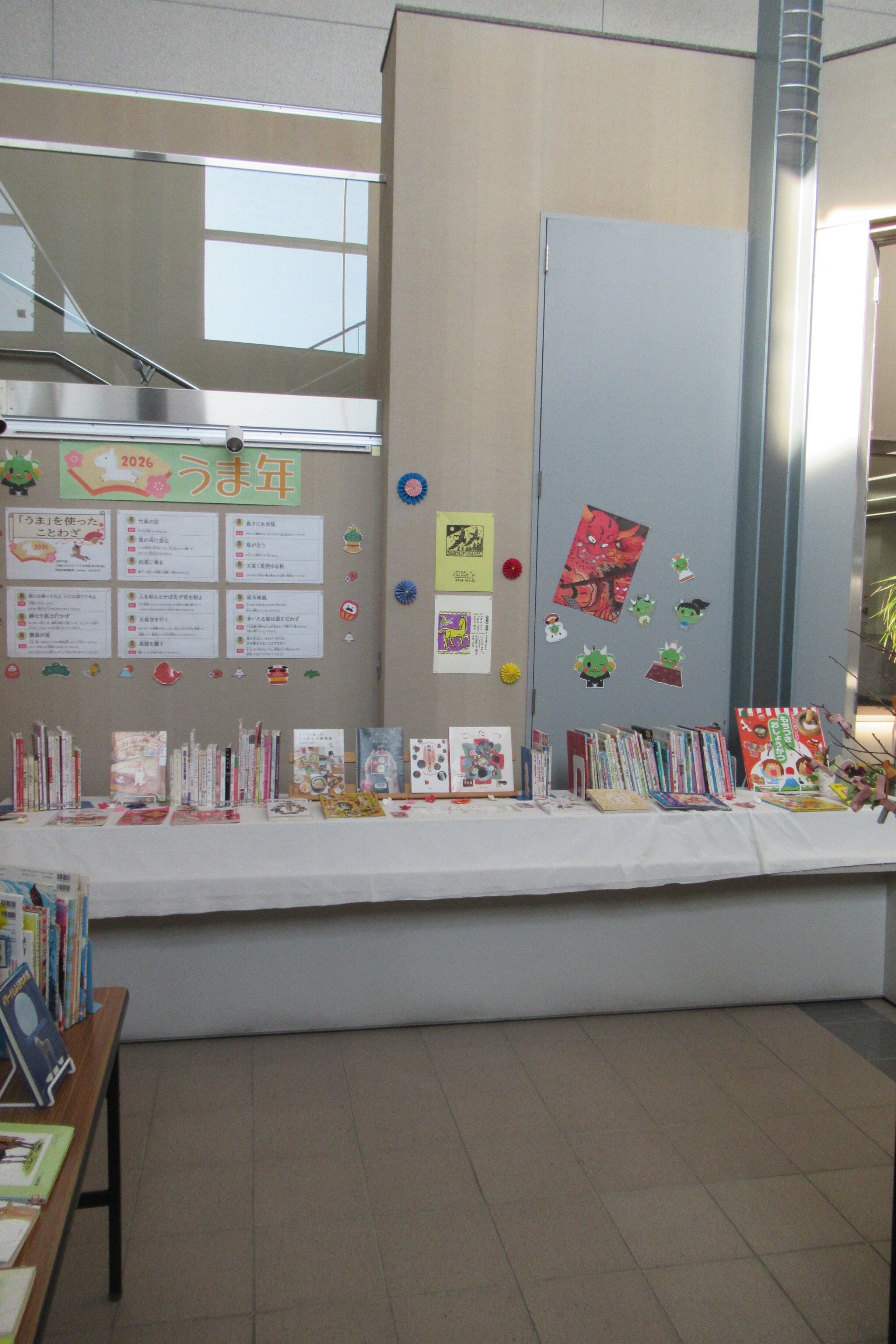 中央図書館では現在、展示ホールで今年の干支である「午(馬)」に関する本の展示のほか、市内の神社、サビエル高校留学生の出身国の新年などについて紹介展示を行っています。