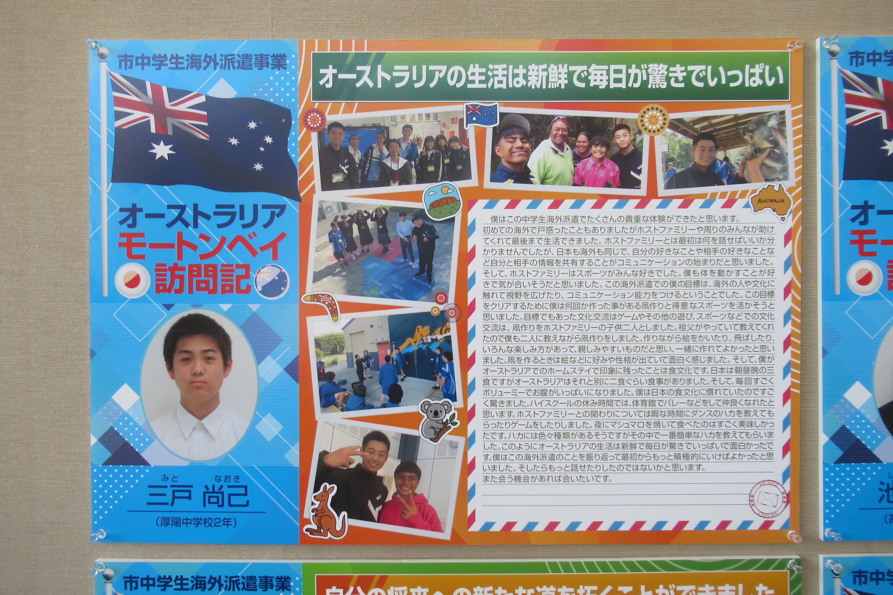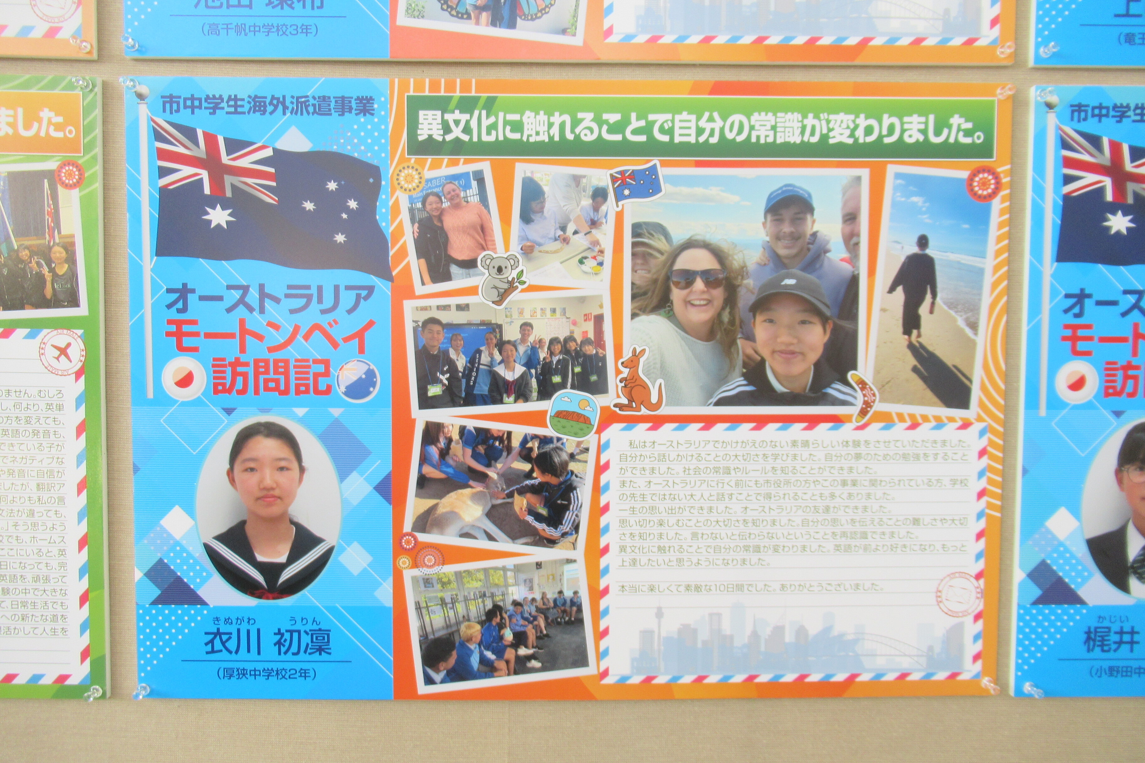 「令和7年度山陽小野田市中学生海外派遣事業」パネル展を開催しています 昨年(令和7年)7月30日から8月10日までの12日間、市内各中学校の代表生徒が友好都市であるオーストラリア・モートンベイ市に派遣された時の体験について、写真を交えてパネル展示を行っています。ご来館の際にぜひご覧ください! 展示場所 中央図書館 市民ギャラリーコーナー(階段踊り場) 期間 2月20日(金曜日)まで 関連リンク 令和7年度中学生海外派遣事業について(市公式ホームページ) 展示についてのお問い合わせ先 市民活動推進課 Tel:0836-82-1134 Fax:0836-83-2604