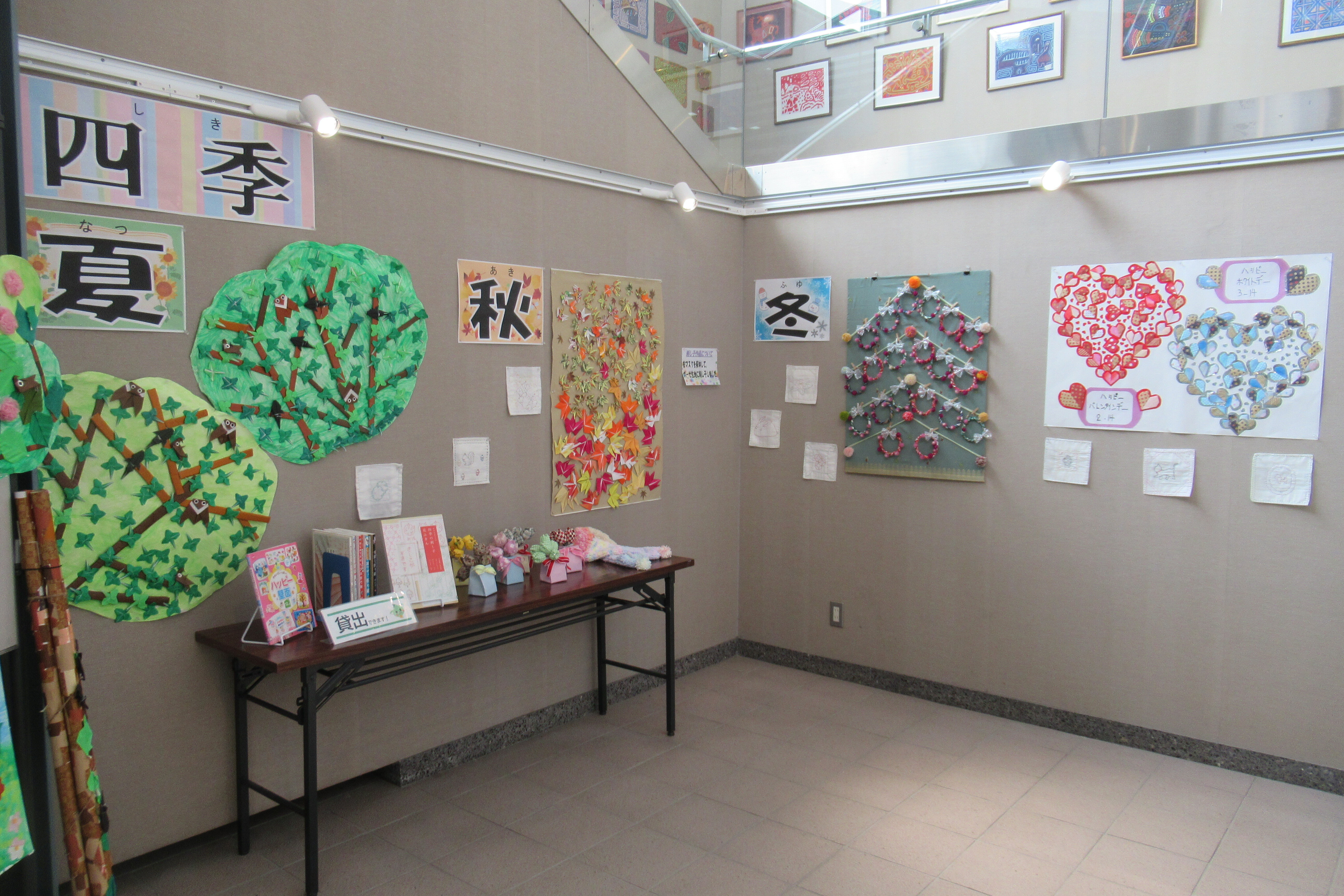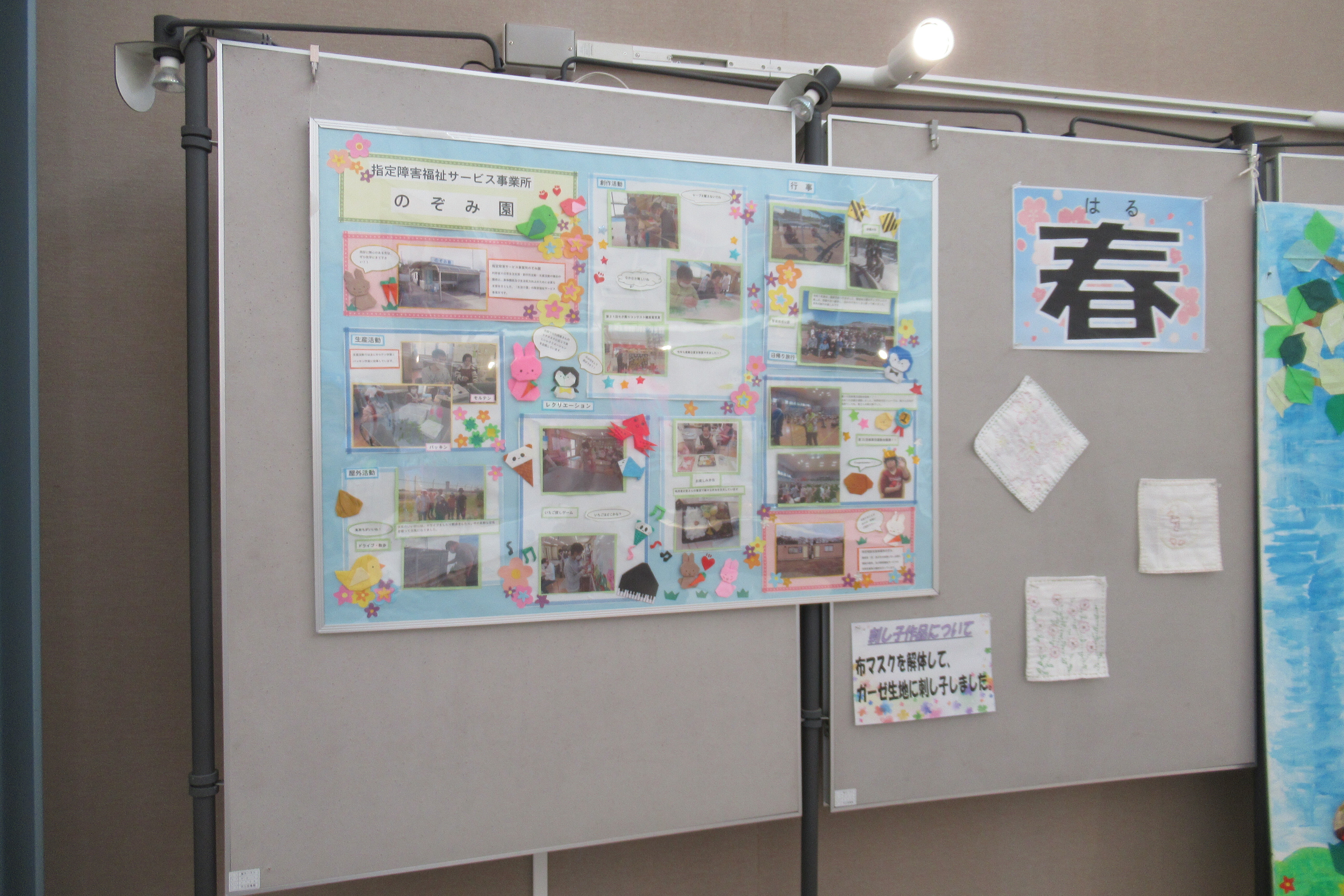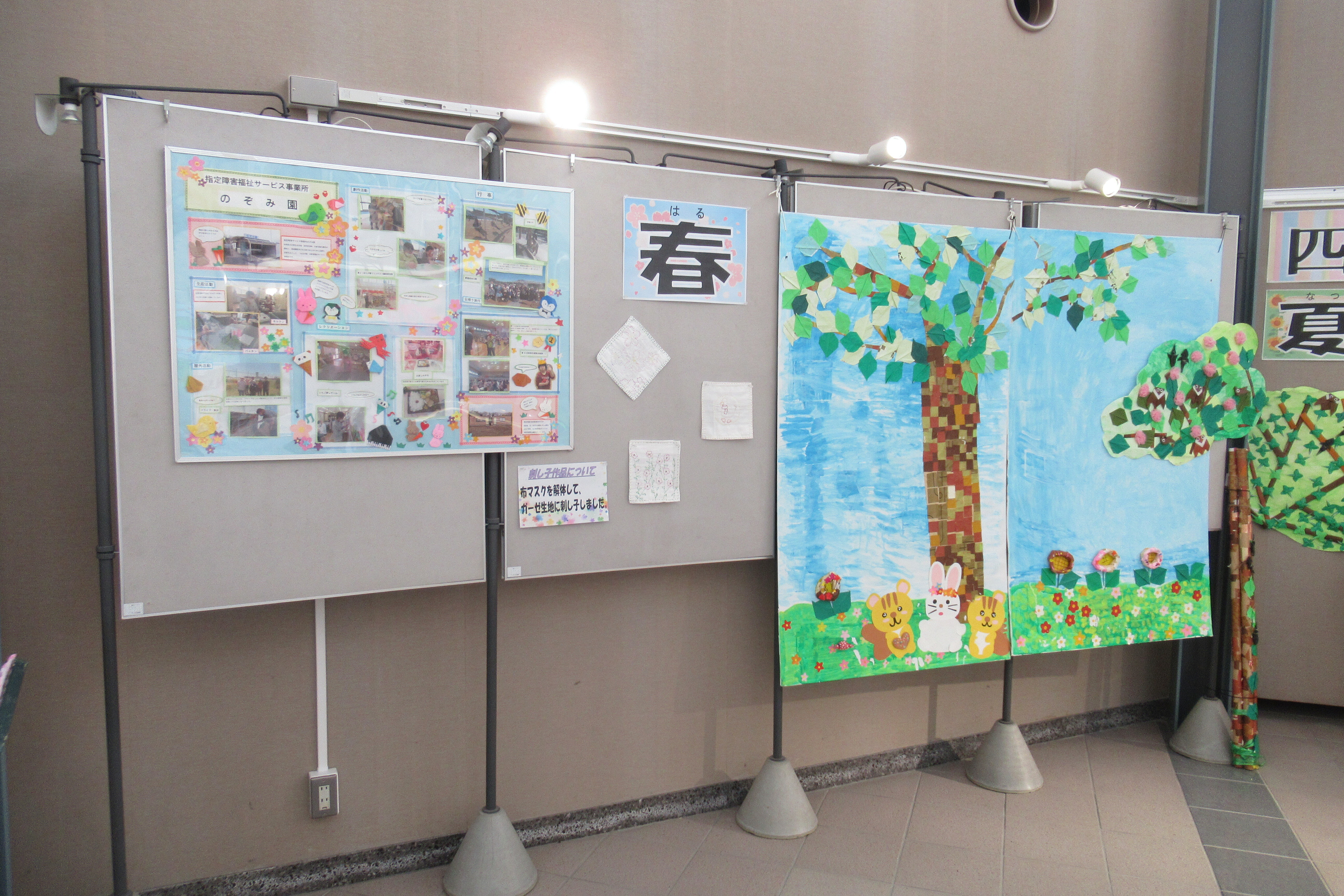 施設利用者の皆さんが心を込めて作った四季折々の自然や笑顔があふれる壁面飾りを展示しています。