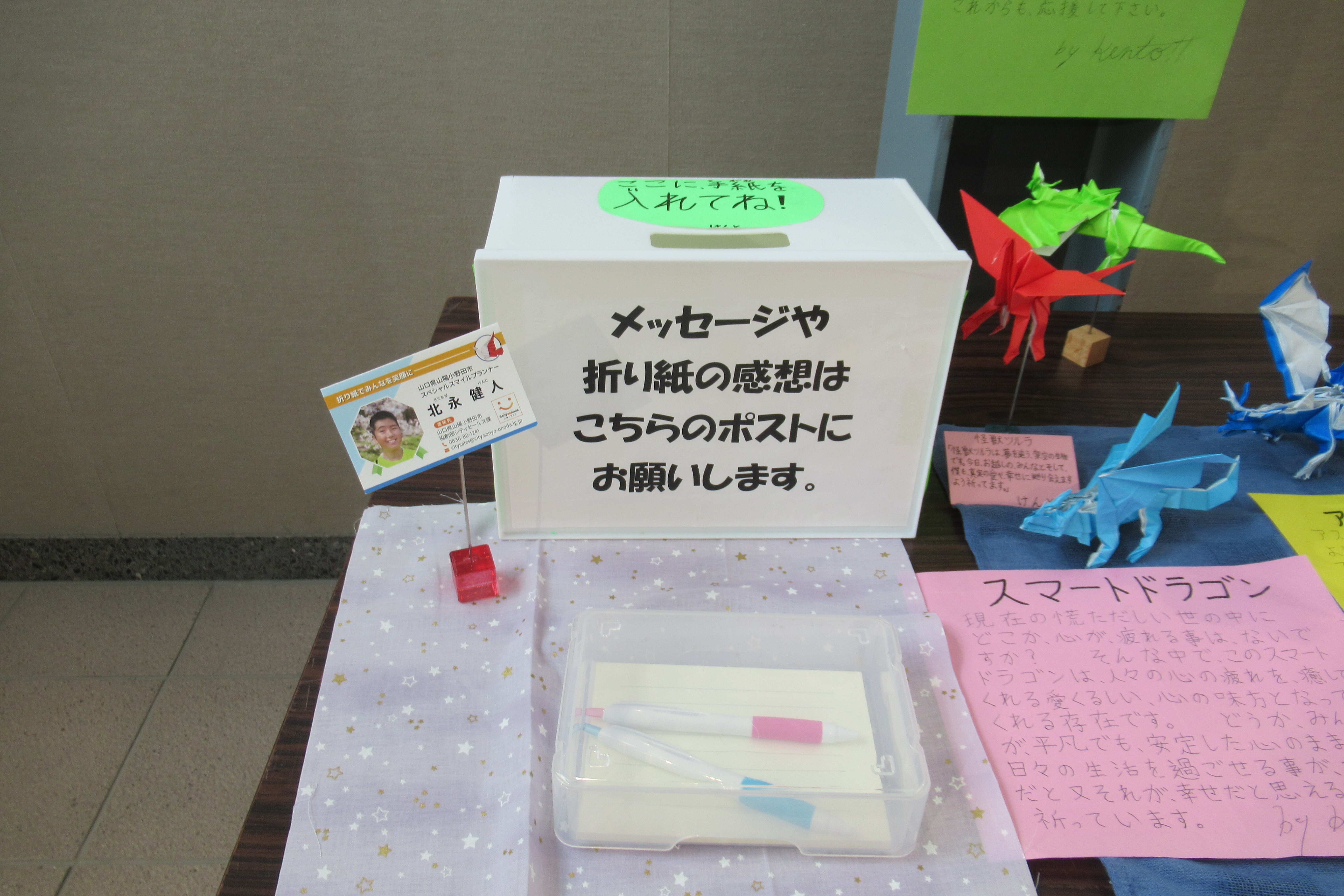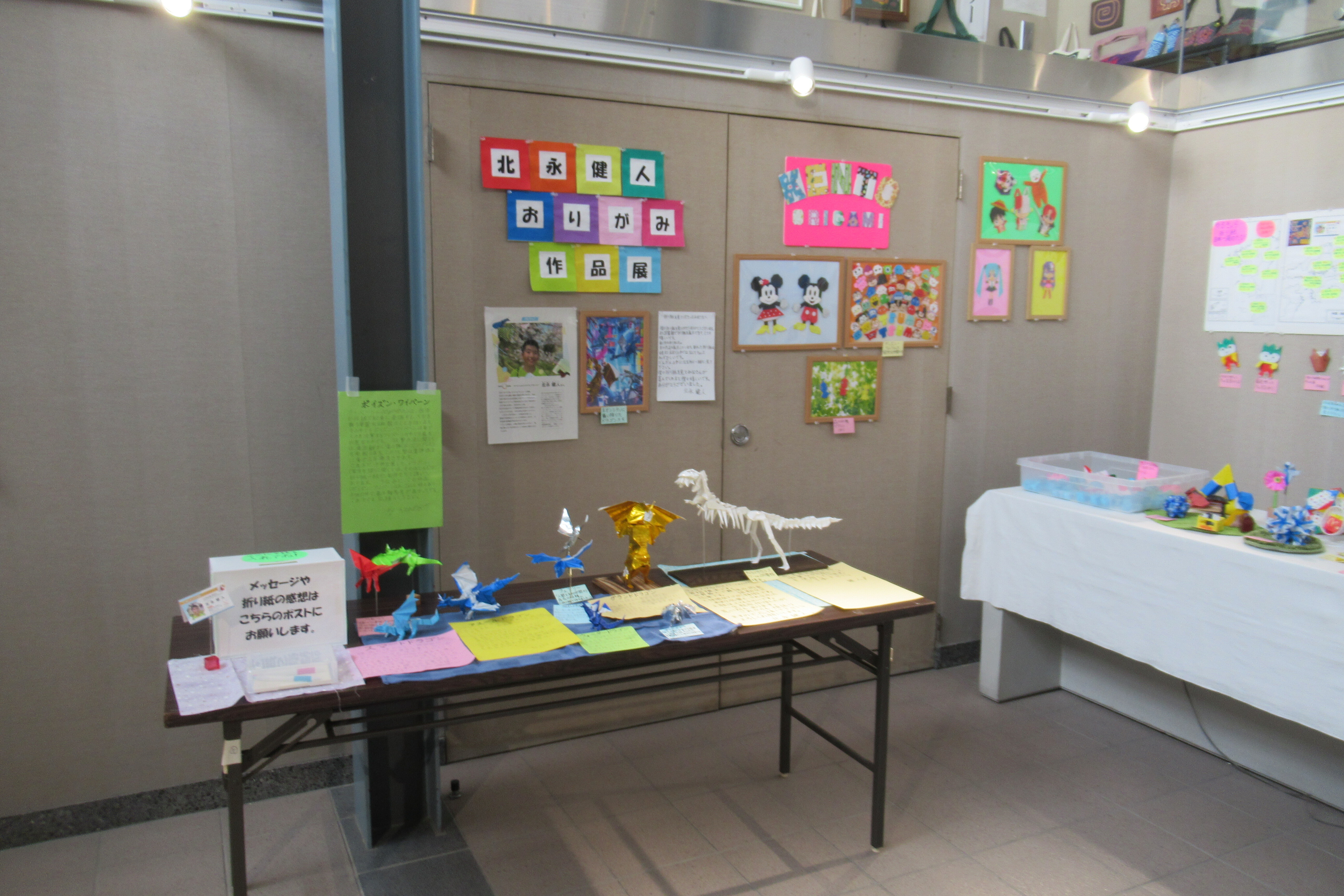 生まれつき心臓の病を抱えながらも、元気に学校生活を送っている北永さんによるユニークな折り紙作品を展示しています。